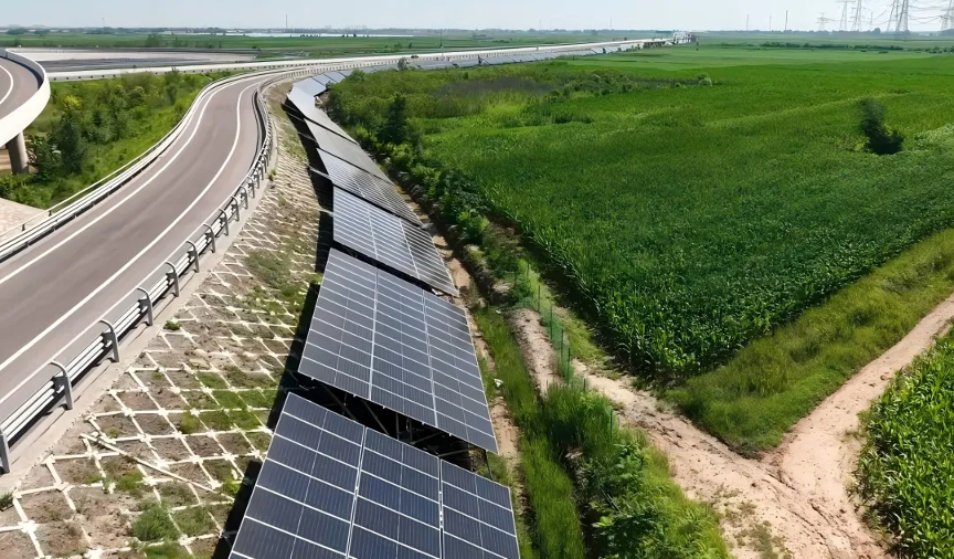 建设期间,面临施工环境恶劣、沿线地形地貌复杂多变、施工作业面分散等困难,项目团队迎难而上,通过制定周密的施工方案,最大限度克服场地限制,显著提升安装效率。项目始终将安全质量放在首位,严格遵守高速公路施工作业规范及光伏安装标准,确保每一块光伏板的安装都精准、牢固、可靠;针对复杂地形优化支架选型与安装工艺,确保了在陡峭边坡等特殊位置光伏板的安全稳定,保障了发电效率。