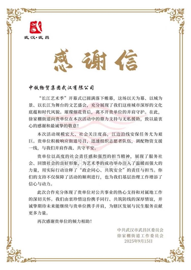中铁物贸武汉公司获感谢信 支援长江文化艺术季显担当