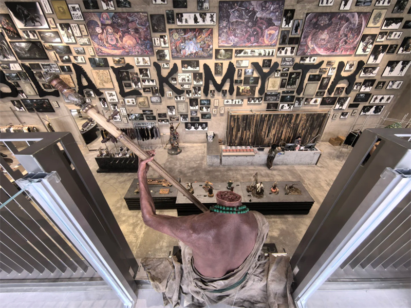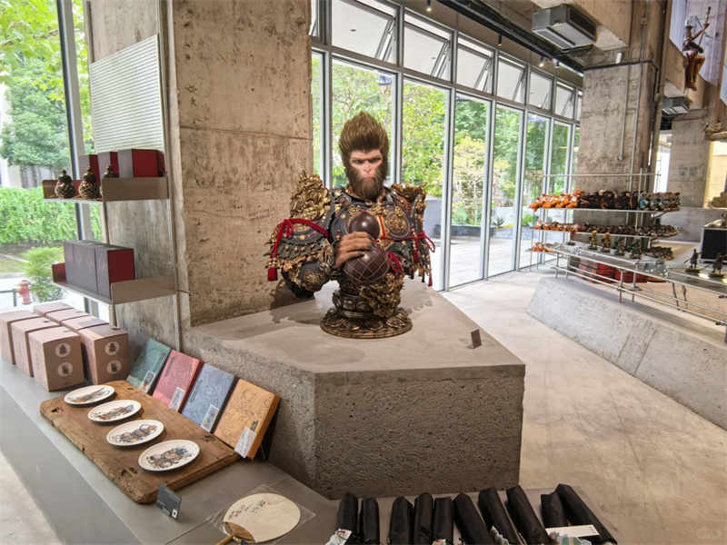 店铺坐落于转塘街道艺创小镇凤凰创意国际。步入店内,瞬间被浓郁的暗黑国风美学包围。店内整体设计延续了游戏独特的视觉风格,巧妙地将虚拟艺术转化为实体体验。其中,钟馗骑虎大型装置尤为醒目,造型威严、细节精致,尽显游戏角色的磅礴气势,也体现出游戏科学对细节的精准把控。