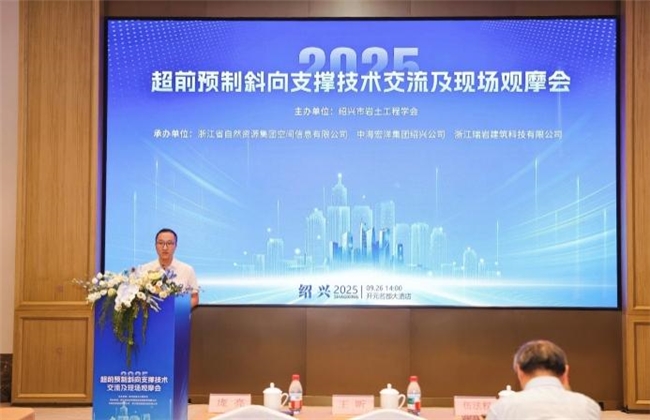 发布时间:2025-09-30 14:31:45 | 来源:中国网 | 作者: | 责任编辑:吴一凡2025年9月26日下午,由绍兴市岩土工程学会主办,浙江省自然资源集团空间信息有限公司、中海宏洋绍兴公司、浙江瑞岩建筑科技有限公司共同承办的“超前预制斜向支撑技术交流及现场观摩会”在绍兴顺利召开。绍兴市住房和城乡建设局工程处处长庞亮,原市建管局副局长张煜,绍兴市柯桥区质监站胡立锋,俄罗斯自然科学院外籍院士、工程地质专家、岩石力学专家、绍兴文理学院教授伍法权等政府部门、行业专家、企业代表等参会,共同探讨最新工程技术应用。中海宏洋绍兴公司助理总经理蔡辉参加会议。