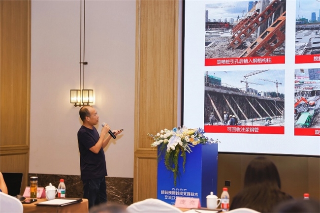 随后,国家注册岩土工程师、高级工程师郦沣以《超前预制斜向支撑技术与应用》为题,系统介绍了该技术的设计原理、施工流程及典型案例,并结合中海宏洋绍兴公司越湖雲起项目的工程实践,重点展示了该技术在提升结构安全性、优化施工效率及实现绿色建造方面的显著成效。