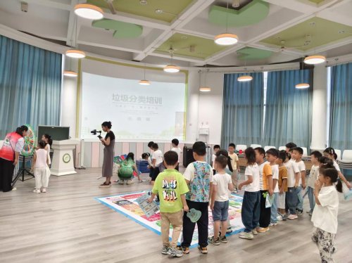 为检验学习成果,志愿者为小朋友们发放了垃圾分类宣传页,随即开启热火朝天的有奖问答与实物投放演示互动。“用过的纸巾属于什么垃圾?”“其他垃圾!”志愿者话音刚落,孩子们的抢答声便此起彼伏,反应格外迅速。问答结束后,更有趣味环节登场——垃圾分类大转盘、掷骰子、四色分类实物投放等互动游戏接连开展,孩子们在欢声笑语中动手实践,进一步加深了对分类知识的记忆。现场,志愿者的引导声、孩子们的雀跃声交织成趣,温馨又热烈的氛围感染着在场每一个人。