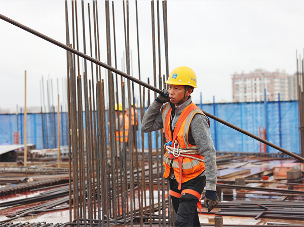 图为建设者们正在搬运钢筋