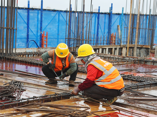 图为建设者们正在绑扎钢筋
