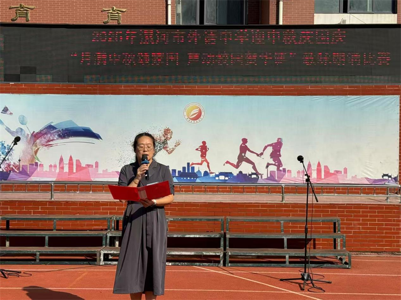 全体起立,升国旗,奏唱国歌!伴随着嘹亮的《义勇军进行曲》,此次比赛正式拉开帷幕。赵磊校长致开幕辞,向全校师生致以双节祝贺。她指出,我们的祖国历经76年风雨征程,从百废待兴到万象更新,从自力更生到自信开放,每一次跨越都凝聚着中国人民的奋斗与坚守。此刻,站在校园中仰望国旗,心中满是对祖国繁荣的自豪与对时代的感恩,更让我们坚定了铭记历史、珍惜当下、开创未来的信念。