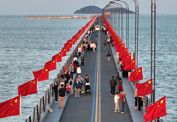走进陆岛交通码头,两侧鲜艳的五星红旗迎风飘扬,在阳光的照耀下显得格外夺目,这抹红色瞬间吸引了众多游客的目光,纷纷驻足打卡拍摄,记录下这美好的瞬间。游客们踏着这抹红色,漫步在千米栈桥上,海风轻轻拂过脸庞,带来丝丝凉意。此时,红色情怀与自然美景交相辉映,仿佛一幅绝美的画卷在眼前徐徐展开。游客们在这美丽的景色中,不仅享受到了大自然的馈赠,更感受到了浓厚的家国情怀,心中对祖国的热爱与自豪之情油然而生。