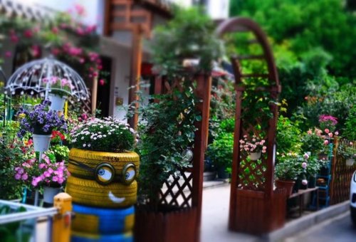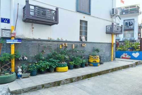 辖区居民郑女士大学主修园林设计专业,毕业后也没荒废本行,平时爱好就是打理家里的庭院,将废弃轮胎“变装”小黄人,使动漫人物走进现实庭院。用完整的轮胎作小黄人的“身体”,用滚筒刷将轮胎均匀涂成亮黄色,用其余废旧材料做成“眼镜框”,小黄人憨态可掬的模样引得游客纷纷驻足拍照。而最引人注目的,当属那些“轮胎花盆”——废旧轮胎经过彩绘装饰,摇身一变成为庭院中憨态可掬的“绿色容器”,盛放着月季、玫瑰、绿萝,为社区增添了一抹别样的生态趣味。