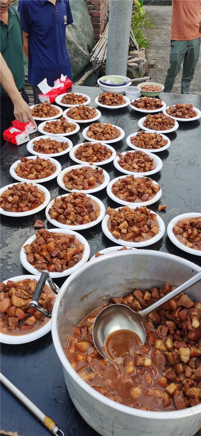 尊老爱幼在我们下湖坵村早已蔚然成风,特别是这些在外事业有成的乡贤们,对家乡的公益事业总是鼎力相助。为了办好这次中秋敬老活动,筹备工作早在半个月前就紧锣密鼓地展开了。有的乡贤负责采购优质大米、新鲜猪肉等各类食材,有的则联系场地、组织志愿者。准备30桌丰盛的宴席可不是件容易的事,活动当天清晨不到7点,负责后厨的20多位志愿者就来到临时搭建的厨房,开始了一整天的忙碌。他们分工协作,有的切肉、有的洗菜、有的掌勺烹饪、有的精心摆盘,从早到晚忙得不亦乐乎,直到下午4点多才完成所有准备工作。