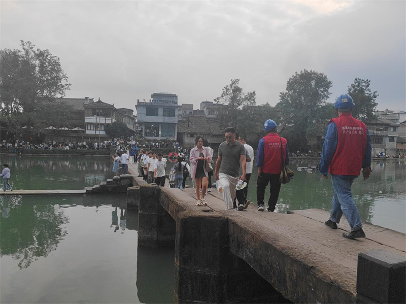“往年过节最怕停电扫了兴,今年从节前就看到电工师傅们来来回回检查线路,现在夜游、看表演一点都不担心,心里踏实!”平乐古镇商户李大姐一边整理着文创摊位,一边笑着说道。双节期间,平乐古镇以“千年鱼龙舞”为主题开展了一系列主题活动,百米竹龙炫彩巡游、南丝路民谣音乐季等特色项目吸引大批游客前来,用电负荷较平日大幅提升。为让这份节日热闹不“断电”,国网邛崃供电公司平乐供电所提前谋划,成立“双节保电专班”,组织巡检小组对古镇及景区周边供电主干线开展“拉网式”排查,重点检修沿街商铺、景区配电箱及照明设施,及时消除安全隐患。当夜幕降临,古镇两岸灯笼次第亮起,江面上游船穿梭,保电人员的身影仍在街巷间穿梭巡检,用脚步丈量安全,让古镇的“夜经济”在稳定电力中焕发勃勃生机,也为乡村文旅发展注入动力。