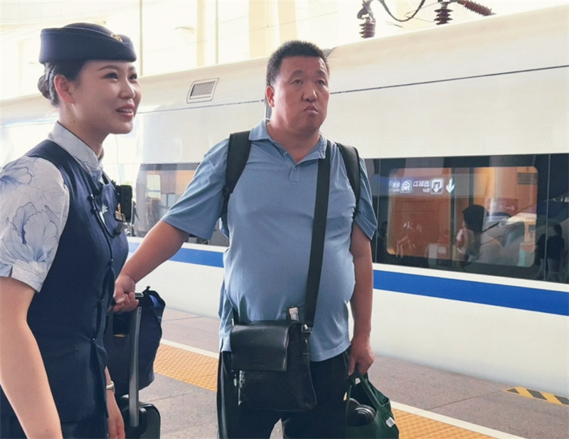 快下车时,李晓萌帮刘先生拿好行李,牵着他慢慢走向车门,稳稳交到车站工作人员手里。刘先生连声道谢,李晓萌笑着说:“这是我们该做的,您慢走。”