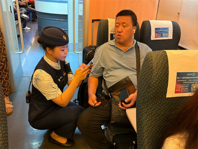 李晓萌把刘先生领到靠近过道的座位,轻声说:“您手前边是小桌板,行李在身后的位置,旁边就是列车的餐车位置,有需要您就及时呼叫工作人员。”旅途中,李晓萌不忘送来热水,帮助旅客操作到站的预约服务,还提前告知到站时间。