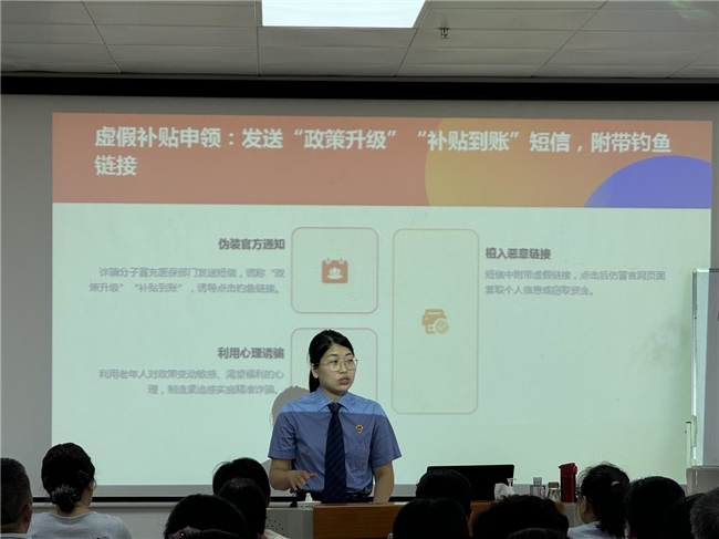 讲座中,检察干警结合最高检通报的医保骗保典型案例及本地实际,用通俗易懂的语言拆解常见诈骗陷阱,详细揭露“借用医保卡空刷买药转卖”“虚构诊疗项目报销”“冒充医保人员诱导更新信息”等不法手段,特别强调老年人出借医保卡可能构成共同犯罪的法律后果。针对“免费领药换医保信息”“医保账户失效需验证”等诈骗话术,干警现场传授“不轻信陌生来电、不点击不明链接、不出借医保卡”的防骗“三不”原则。