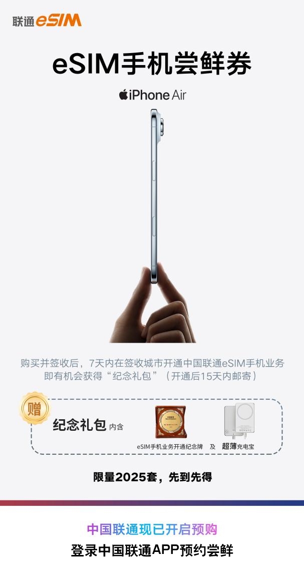为回馈首批体验用户,安徽联通特别准备了多重尝鲜福利。凡成功预购iPhone Air并开通eSIM业务的用户,可免费获得定制“eSIM业务开通纪念牌”与超薄充电宝,这套专属礼遇限量2025套,先到先得,为用户赋予独特的“尝鲜者”身份标识。