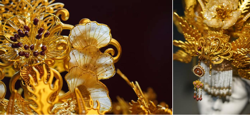 “中药之冠”由扬子江联合文化创作博主共同打造,设计灵感源自传统龙凤冠,既承载了“龙凤呈祥”“健康长寿”的美好寓意,又实现了对中药材的艺术化再造。制作团队从上百种药材中精选20余味,用特殊工艺保留药材天然质感与清雅药香:木蝴蝶被塑造成层叠的牡丹花瓣,金银花与红豆搭配成精巧花蕊,冠冕流苏则由多味药材研磨制成的香珠串联而成,成为可观赏、可感知的中医药文化新载体。
