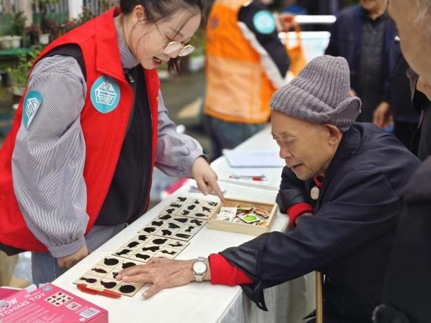 为了增加活动的趣味性和参与度,特别是为了让大众在轻松愉快的氛围中理解认知障碍老人可能面临的感知挑战,活动特别设置了游戏区。“蒙眼辨物”环节,参与者戴上眼罩后,仅凭手部触觉来识别物体,体验感知世界的另一种方式;“影子配对”环节则考验参与者的观察力与逻辑思维能力,通过选择影子题板并配对相应图案木片来完成挑战。参与者们踊跃尝试,在游戏中体验乐趣,也间接体会到认知功能对于日常生活的重要性。完成游戏通关的参与者还能获得活动印章,集齐印章即可领取奖品,进一步激发了大家的参与热情。
