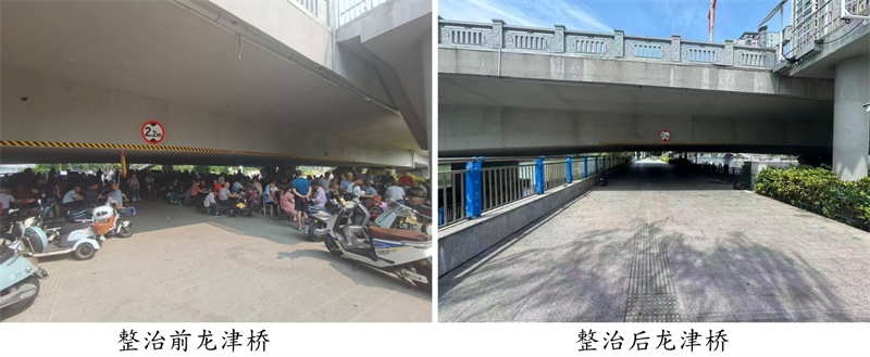 针对不同桥梁治理难点,六合区优化模式,推行“一桥一策”精准疏导,推动治理从“事后处置”转向“事前预防”。通过实地调研发现:龙津桥南北两侧因占道打牌导致环境脏乱,古棠桥南侧则存在聚集跳舞影响行人通行。治理中,一方面联合社区开展集中约谈与现场劝导10余次,明确整改时限,引导居民前往社区活动中心;在重点区域更新绿化隔离设施、设置文明告示牌。另一方面,组织5次环境卫生专项整治,协同园林部门整合资源,优化桥下空间布局,将古棠桥南侧闲置区域改造为休闲场所,让河滨步道重现整洁有序。
