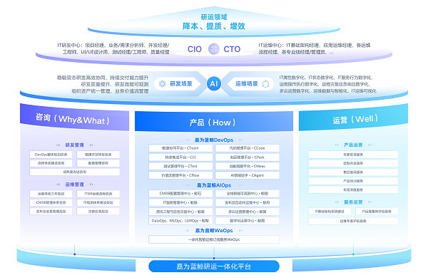 嘉为蓝鲸,是业界知名的数字研运解决方案品牌,结合先进的蓝鲸PaaS技术架构、融合嘉为科技20余年研运经验打造的一体化平台,包含:一体化、平台化、智能化运维解决方案AIOps,一站式研发效能解决方案DevOps,一体化智能运维订阅服务产品WeOps。