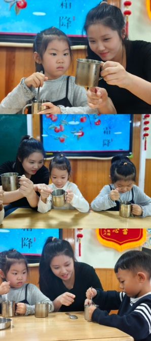 活动中,幼儿在教师的专业指导下,以小水杯、冰块、碎盐为核心材料,遵循科学步骤开展实验,持续观察杯壁的变化。当杯壁逐渐出现白色霜状物质时,幼儿们直观感受到了科学现象的奇妙,在实践中开启了对“霜”的认知之旅。