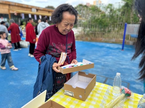 本次活动以“趣味互动+温情体验”为核心,精心设计了多个环节,确保每位参与者都能乐在其中。其中,游戏互动区最受大家欢迎,社区设置了“母鸡下蛋”“乒乓过河”“套圈赢礼”“夹弹珠挑战”4个趣味游戏,每个游戏都兼顾了趣味性与适宜性,既能让老年人活动筋骨,又不会过于劳累。“母鸡下蛋”游戏中,老人们手拿装有乒乓球的盒子,将乒乓球抖落至指定区域,掉落的瞬间引得周围阵阵欢笑;“乒乓过河”考验耐心,只见老人们小心翼翼地将乒乓球从一个纸杯吹到另一个纸杯,全程不能用手触碰。“套圈赢礼”前更是排起长队,大家瞄准心仪的生活用品,抛出圈圈时的期待与套中后的欢呼此起彼伏;“夹弹珠挑战”则细致考验耐心,老人们专注地用筷子夹起弹珠,孩子们在一旁踮脚观看,时不时帮着数数,祖孙间的互动格外暖心。所有游戏设置打卡机制,居民完成4个游戏打卡后,即可领取艾草锤,大家拿着奖品,脸上都洋溢着满足的笑容。