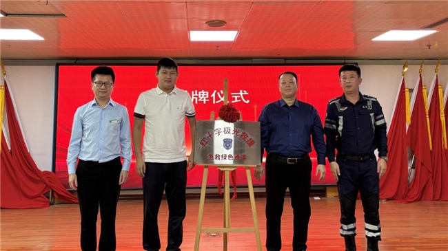 南安市卫健系统党委委员、市红十字会常务副会长洪诗煊,水头镇党委副书记李振兴、南安市海都医院李联敬院长、南安市红十字极光应急救援队队长王天星共同为“红十字极光救援急救绿色通道”揭牌。