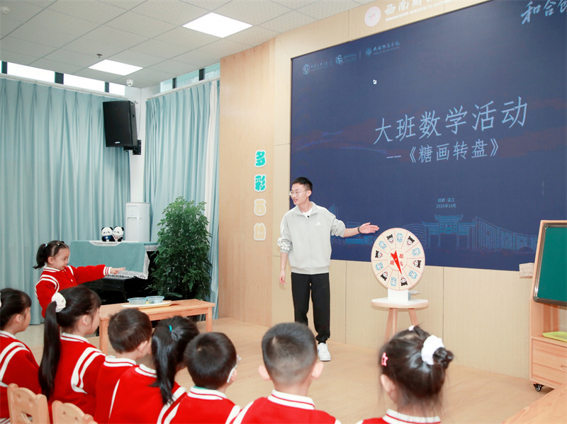 如果说早操是“动起来的思维游戏”,那么二楼多功能厅的集体教学观摩,则是“坐下来的趣味探索”。西财附幼教师鲍文执教的《糖画转盘》活动,巧妙融入成都非遗文化元素,结合幼儿喜爱的动画形象“哪吒”和“敖丙”,创设“糖画转盘”游戏情境,引导幼儿在观察、操作、推理中发现规律、创造规律、应用规律,提升逻辑思维与语言表达能力。