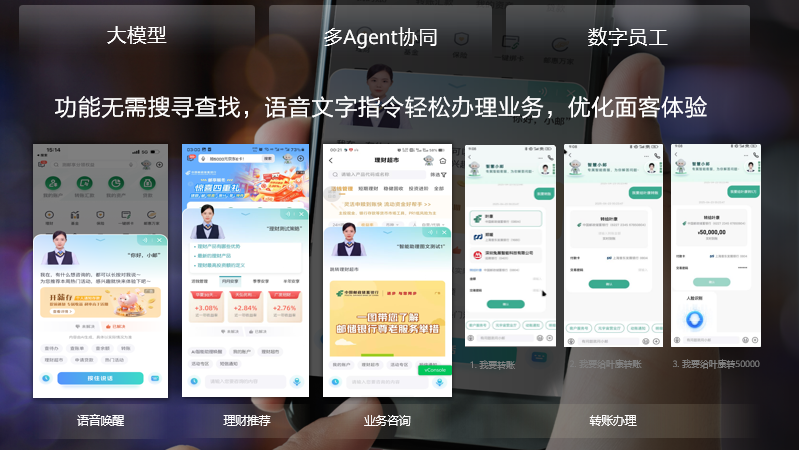 前台通过大小模型结合,落地AI赋能的“需求感知-策略生成-精准触达-决策优化”流程,实现客户服务升级、交互模式创新以及经营发展提效;中台结合大模型、RPA等新技术,对交易进行自动化、智能化流程重塑,实现“自动替代手动”、“机器替代人工”;后台将专家经验融入思考模型,融合多维度多模态数据开展人机协同分析,实现风险管理从“经验依赖”向“智能驱动”的转变;以下为几个典型的智能应用场景: