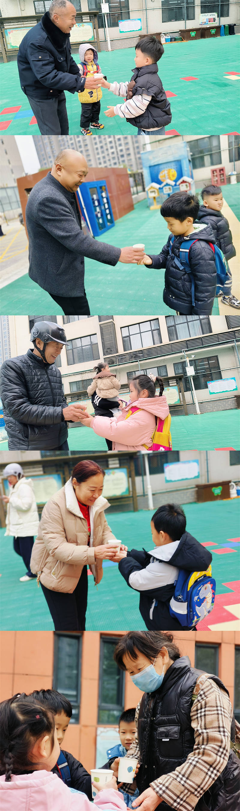清晨的幼儿园,浸润在温馨的氛围中。入园时段,孩子们化身“暖心小使者”,手持提前精心准备的热茶,雀跃着奔向送小朋友入园的爷爷、奶奶、外公、外婆。“爷爷,您快喝杯热茶,天凉了暖暖身子!”“奶奶,重阳节快乐呀!”稚嫩的童声带着纯粹的真诚,当孩子们双手郑重地递上热茶时,老人们的脸上瞬间绽放出欣慰的笑容,眼角的细纹里满是感动的涟漪。