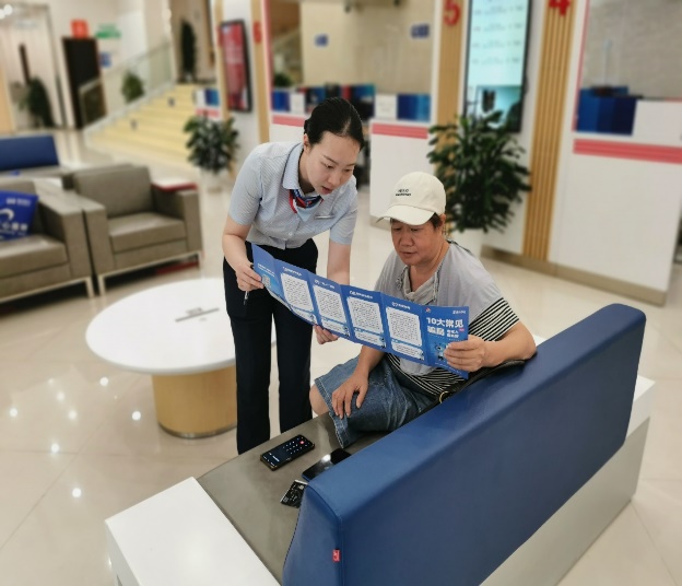 活动期间,大堂经理主动向前来办理业务的客户发放宣传折页与手册,聚焦防范金融诈骗、打击非法集资、保障网络操作安全等实用知识,用通俗语言为客户详细讲解;柜面员工则在业务办理过程中,同步提醒客户相关业务的防诈要点,并及时科普最新出现的电信网络诈骗手段,将宣传融入服务细节,切实提升客户风险防范意识。