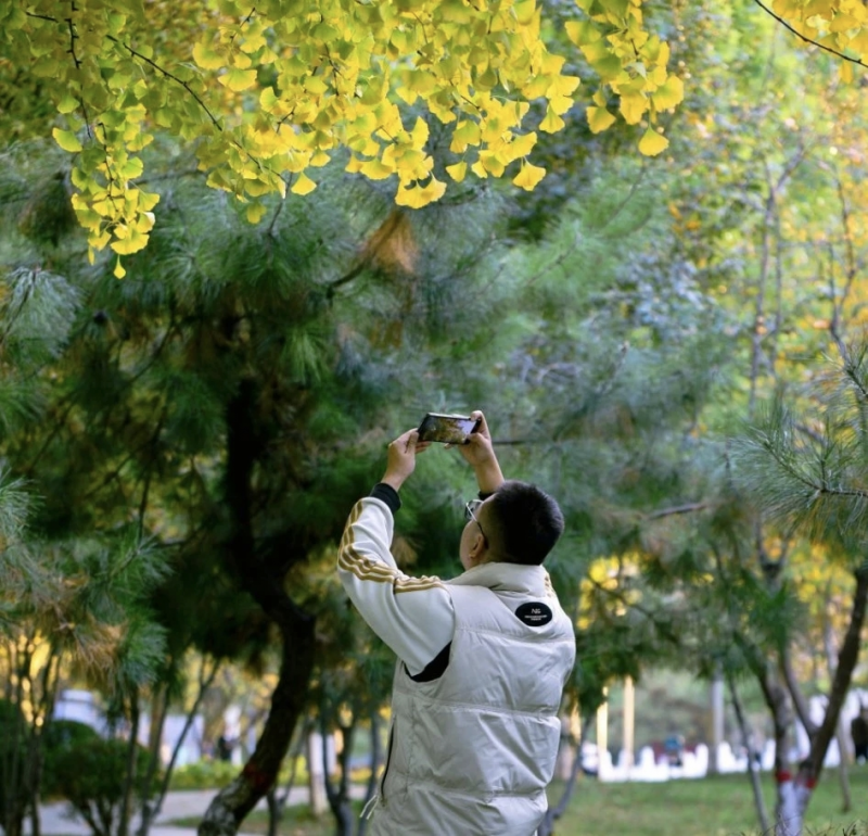 此刻西清公园的银杏,正处于一年中最绚烂的状态,300多棵银杏树集体换上金黄盛装,将园区晕染成一片温暖的金色世界。它们主要集中在公园甬路两侧和下沉广场,甬路两旁的银杏连成“黄金通道”,每走一步都像踏在秋日的画里;下沉广场的银杏则围成一片金色天地,抬头就是满眼耀眼的黄。叶片像小巧的金箔,在枝头轻轻晃动,仿佛在和路过的人热情打招呼。阳光穿过枝叶的缝隙,在地面洒下星星点点的光斑,踩在松软的落叶上能听见“沙沙”的声响,这种沉浸式的秋日体验,让每个到来的人都能卸下疲惫,沉醉在这片金色里。(石家庄市园林局:陈帅)