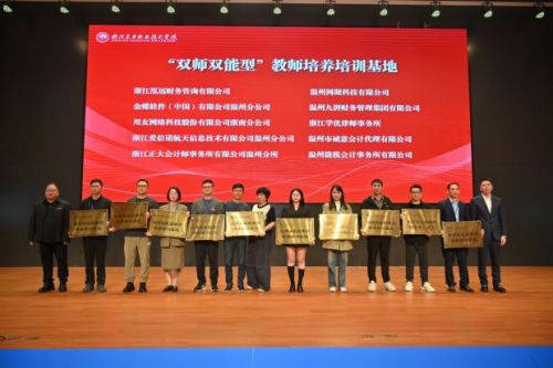 王佑镁分别与用友浙南分公司总经理黄东荣、中联集团浙江分公司总经理朱文明分别为“中小企业数智化产教融合实训服务中心”和“企业财税数字化云服务中心”揭牌。学校党委委员、纪委书记郑铁豪与龙湾区工商业联合会党组书记孔繁义共同为10家企业授予“双师双能型”教师培养培训基地,郑铁豪与龙湾区委统战部常务副部长林克钦为10家企业授予“校外实习”基地。