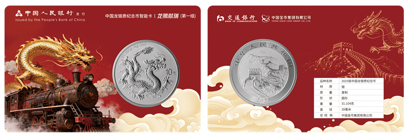 其中,“龙腾献瑞”是交行与中国金币联合推出的中国龙银质纪念币,主题图案为巨龙腾空,象征民族复兴,并镌刻交行“火车头”标识,寓意使命在肩、风驰电掣。该产品内嵌NFC智能芯片,通过手机轻触即可核验产品信息,实现科技防伪与便捷查询的双重优势。