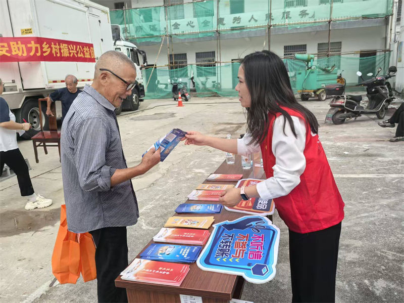 外场设立了多个服务摊位,九龙医院的内科、口腔科、呼吸科等专家医生现场坐诊,为百余位村民提供免费诊疗和健康咨询,将专业医疗服务直接送到村民“家门口”。“金融知识宣传区”志愿者通过发放宣传折页等形式,针对农村常见的电信诈骗、养老骗局等情况进行现场讲解,累计发放金融知识折页120余份,覆盖反诈、维权、保险常识等六大模块,进一步提升村民反诈意识和能力。