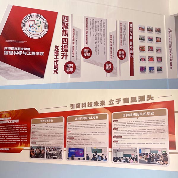 学院党总支积极落实第一议题制度,深入开展校园文化育人实践,大力弘扬红色文化,通过党总支中心组理论学习、读书班、“三会一课”、主题党日、赴红色教育基地参观学习、推广学习强国运用等形式,以党建引领深耕文化育人,引导师生知史爱党、知史爱国。在各楼层和办公室、教室设立党建文化墙,结合学院开展的“一院一品”文化墙建设,达到“润物细无声”的育人效果。