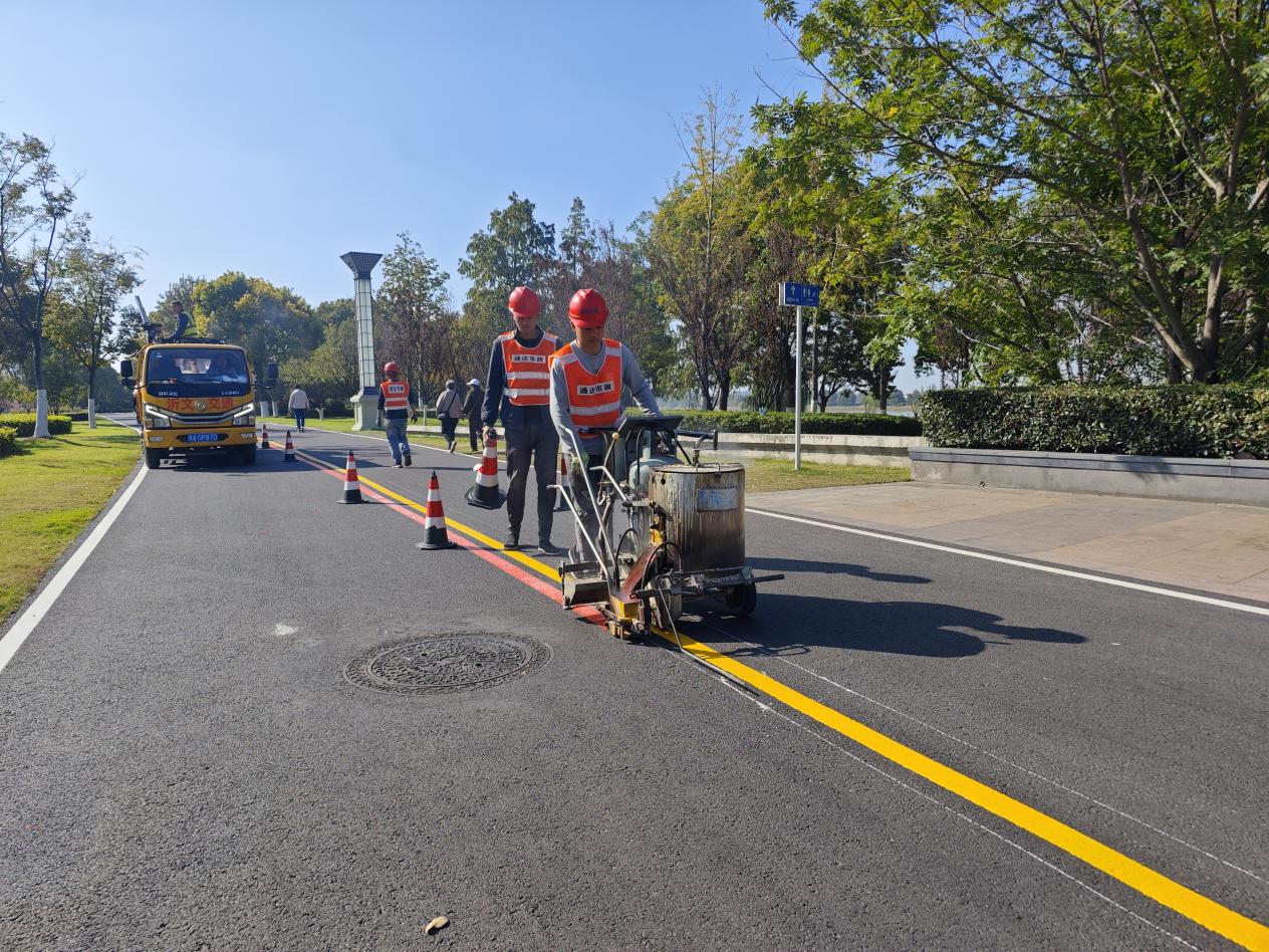 在“焕新颜”方面,施工团队对绿道全线约3万平方米的老化破损路面进行铣刨处理,重新铺设沥青,让路面恢复平整质感;同时创新性喷涂彩虹标线,将生态景观与人文设计相结合,打造出兼具观赏性与实用性的滨水绿道场景,为市民休闲增添一抹亮色。