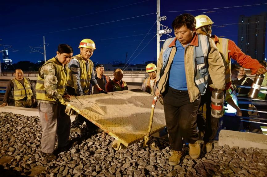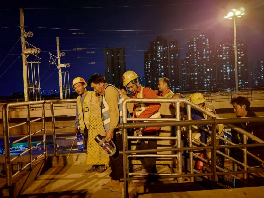 20时57分,为抢回耽搁的时间,作业人员们加快脚步向作业地点进发。工具包与安全帽碰撞发出的声响,成为夜色中最动人的旋律。