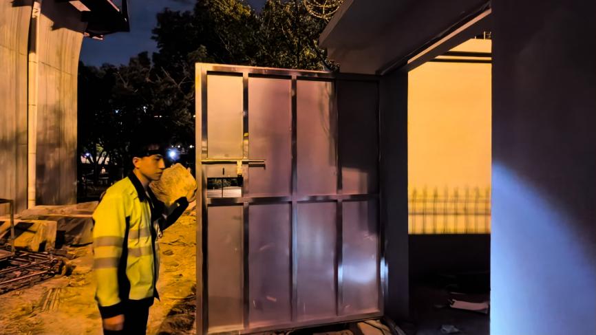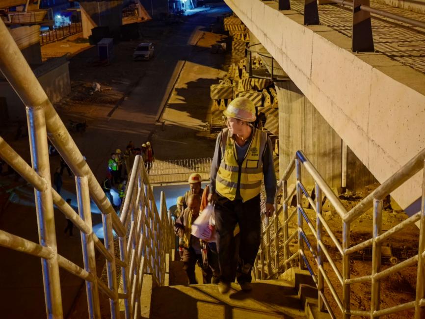 21时24分,四名施工人员协力抬起沉重的平板车。这是运送材料和工机具的重要装备,每一步都要走得稳妥。四个多月的默契配合,让他们的动作如行云流水。