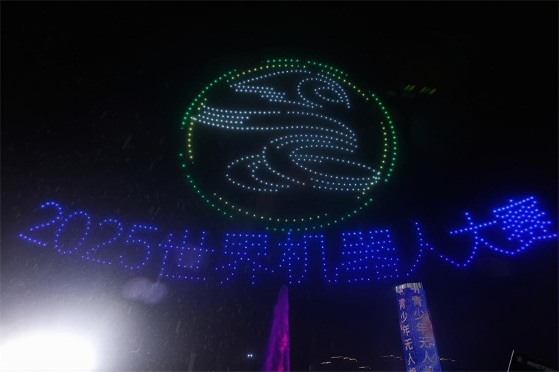 在激动人心的启动仪式环节,与会领导嘉宾共同按下激光启动装置。刹那间,1000架无人机腾空而起,在夜空中精准排列组合,先后呈现“2025世界机器人大赛”、“FTF青少年无人机赛浙江省选拔赛”等巨幅画面,最终定格为“青春驭空,虞见未来”的主题字样。配合着曹娥江两岸的喷泉灯光秀,整个城市阳台成为科技与艺术交融的光影海洋,引得现场观众阵阵惊叹。