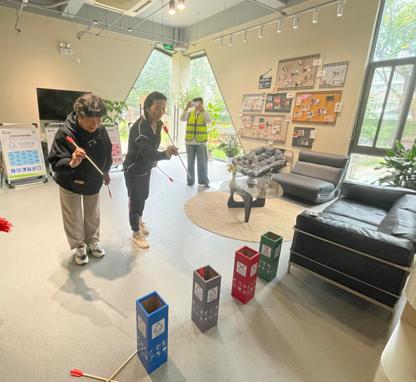 随后,专为长者设计的“垃圾分类投壶”游戏将气氛推向高潮。老人们根据问题将箭镞精准投入对应的分类桶中。欢声笑语间,环保知识已悄然内化于心,全情投入的长者们成为活动现场一道靓丽的“银色风景”。