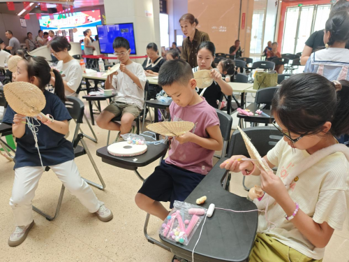 拍卖环节结束,家长与孩子共同投入蒲扇DIY环节,为炎炎夏日消除一份热量。孩子们发挥天马行空的想象力,家长们则提供巧手支持,一笔一画、一粘一贴间,独一无二的创意蒲扇诞生。发挥了孩子的动手能力与艺术创造力,更在亲密协作中加深了亲子情感纽带。同时为了庆祝世运会的成功举办,现场设置了“合力叠塔”的互动环节,将世运会中强调的“团结与坚持”理念、竞技元素转化为适合儿童的趣味挑战。两个小组通过拉紧绳子控制挂钩,协作将积木一块块吊起并平稳叠放,最终搭建出完整的“塔”。“叠塔”不仅能锻炼手眼协调和耐心,更让孩子们体会到合作共赢的意义。