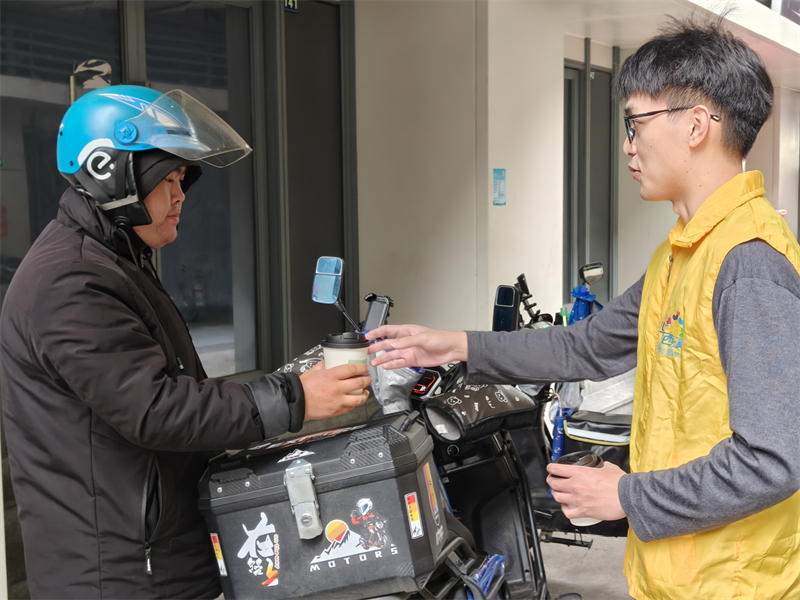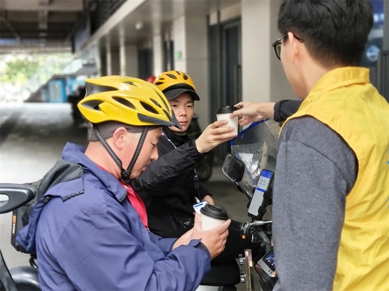 活动当天,工作人员与志愿者一早熬制好红糖姜茶,清甜的香气伴随蒸腾的热气,萦绕在整个驿站。随着骑手们陆续到来,一杯杯姜茶被迅速递上,“立冬了,喝杯热的暖暖”“辛苦啦,路上注意安全”……简单的话语承载着真挚的关怀。骑手们接过姜茶,有的捧在手心呵着气,有的迫不及待饮下一大口,暖意从指尖蔓延至心底。