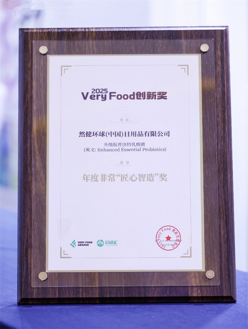 发布时间:2025-11-14 13:49:21 | 来源:中国网 | 作者: | 责任编辑:吴一凡2025年 11月 11日晚,由食研汇 FTA主办的 2025 Very Food创新奖颁奖典礼在杭州国际会议中心举行,本届大赛旨在对食品行业中做出重大贡献、取得巨大成就的上游原料、终端产品和科研创新成果等进行表彰。经过激烈角逐和专家评审,然健环球(中国)日用品有限公司旗下明星产品升级版普洛特乳酸菌获得2025年度非常“匠心智造”奖。