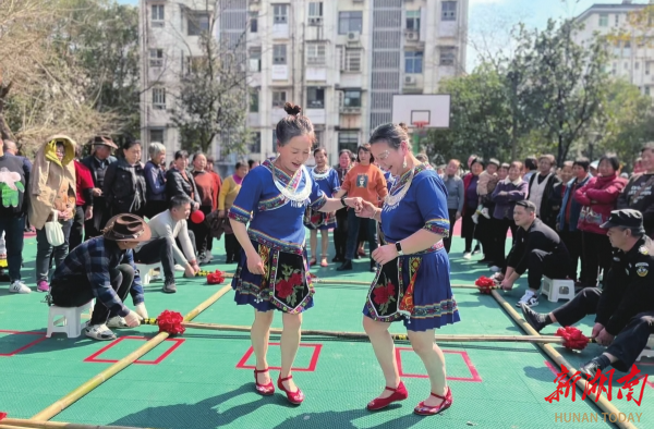 七斗冲社区开展“燃情篝火·共舞民族风”活动,居民在跳竹竿舞。本文配图均为蔡奕摄(湖南图片库)