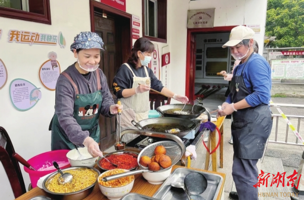 七斗冲社区长者食堂开办后,居民积极参与食堂运营。“灯盏窝是沅陵传统美食,食堂头一天晚上就开始准备,社区老人也带着家里的厨具来帮忙,指导食堂师傅烹制。”苗族大姐向梅说,这一口油炸小吃,勾起了她的童年回忆。
