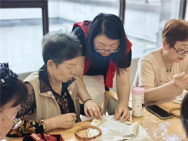 动手制作环节,邻里间的互助氛围格外浓厚。针法娴熟的居民主动帮新手穿针引线,还不忘分享垃圾分类经验:“我家孙子现在都会把废电池放进‘有害垃圾’桶,你们也可以在包上缝个小标签,提醒自己分好类。”稍显生疏的居民在指导下逐渐找到手感,还会指着布料图案讨论:“这个绿色布料适合当‘易腐垃圾’分类标记,那个蓝色的可以做‘可回收物’标志。”家住景溪北苑的阮阿姨一边缝包一边感慨:“既能学非遗手艺,又能记垃圾分类知识,还能和邻居聊天,这样的活动太有意义了!”