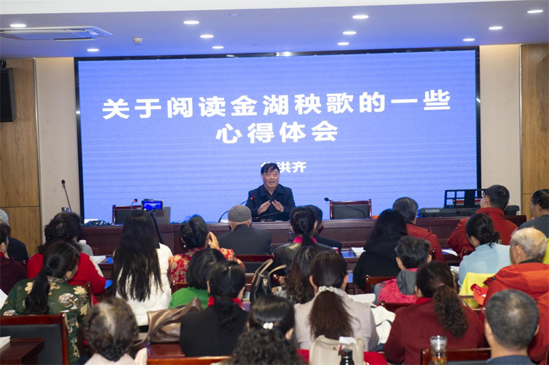 首日上午,培训班特邀华洪齐、陈剑峰、房忠诚三位本土文化研究学者分别围绕《关于阅读金湖秧歌的一些心得体会》《金湖秧歌杂谈》《金湖秧歌的音乐艺术特点》作了专题讲授,从文化理解、历史脉络与音乐艺术等多个维度开展教学。随后的培训以实践教学为主轴。13日下午及14日上午,由黄德玉老师担纲主讲,系统开展了金湖秧歌经典曲目的教唱教学,并组织非遗传承人现场施教,帮助学员从理论走向实践,从聆听走向演唱。