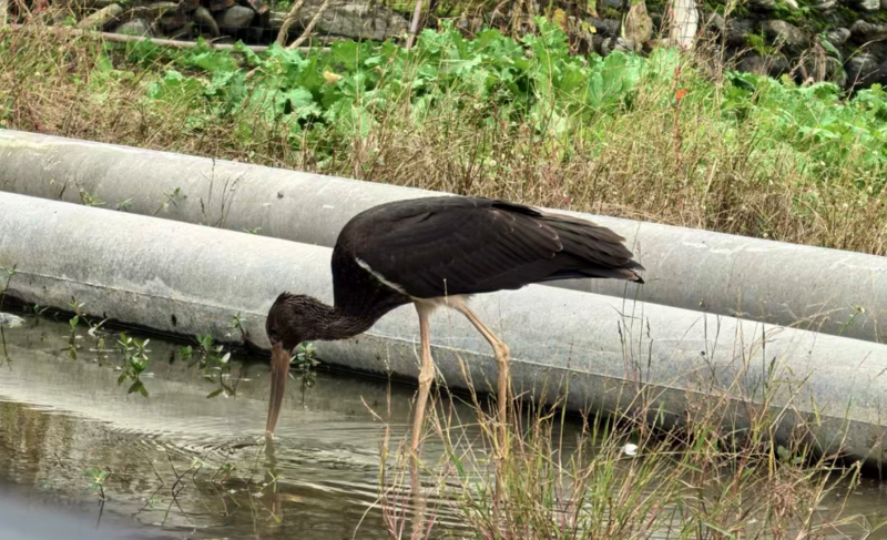黑鹳又名“乌鹳”“锅鹳”,体长约1米,体态舒展优雅。其独特的外形极具辨识度:上体羽毛呈黑色,在阳光下泛着紫绿色金属光泽,胸下部及腹部则为洁白色,嘴与腿部均呈鲜明红色。作为迁徙性鸟类,黑鹳夏季广泛分布于我国北方各省,冬季多迁徙至南方越冬。此次观测到的黑鹳个体数量不少于 3只,多次在雨后天晴时现身河边觅食,专家结合其活动规律研判,该种群可能已在当地定居。