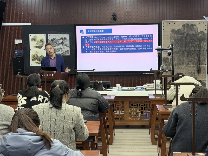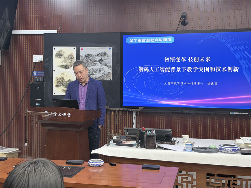 发布时间:2025-11-18 14:22:43 | 来源:中国网 | 作者: | 责任编辑:吴一凡为深入推进人工智能与教育教学的深度融合,提升教师数字素养与技术创新能力,11月12日,兰溪市教育技术和信息中心徐良勇老师受邀赴磐安县尚湖镇初级中学,面向全体教师作题为《智领变革,技创未来——解码人工智能背景下教学突围和技术创新》的专题讲座。作为金华市智慧教育讲师团成员,徐良勇老师长期专注人工智能教育应用实践,在AIGC、数字人、跨学科场景构建等领域具有丰富经验。