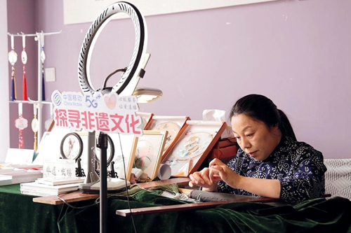 发布时间:2025-11-19 14:38:53 | 来源:中国网 | 作者: | 责任编辑:吴一凡近日,“水韵江苏·家门口享非遗”展示活动在江苏盐城举行。在现场,参观者可以体验全省各地的非遗技艺。同时,中国移动江苏公司盐城分公司还为东台发绣等本地非遗工作室搭建5G直播间,利用高清直播详细展现非遗技艺的细节,开通线上渠道进行网络销售。网友通过互联网就可以感受传统文化的魅力,为非遗文化的传播和传承贡献力量,助力增强民族自豪感和文化自信。图为东台发绣非遗传承人正通过移动5G直播间向网友展示绣法细节。