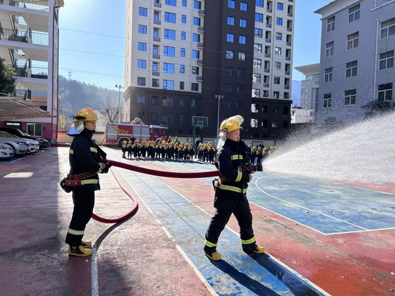模拟火灾扑救环节将活动推向高潮。消防员现场讲解了水带连接、水枪操作的基本技巧,并设置了安全的模拟火灾场景。在消防员的专业指导下,孩子们两人一组,合力铺开消防水带、连接接口,手持水枪对准“火源”喷射。“对准火苗根部!”“用力往前推!”孩子们听从指挥、默契配合,专注投入地完成了灭火操作,欢呼声、呐喊声此起彼伏。通过实操演练,孩子们初步掌握了基础灭火技能,增强了应对火灾的应急反应能力。