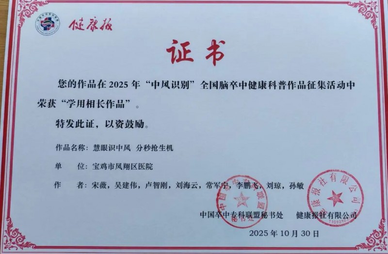 大会期间,另一则捷报传来:在国家卫生健康委百万减残工程专家委员会指导,中国卒中专科联盟与健康报社联合主办的“中风识别”全国脑卒中健康科普作品征集活动中,凤翔区医院卒中中心参赛作品《慧眼识中风、分秒抢生机》从全国500余件作品中脱颖而出,荣获“学用相长作品”国家级殊荣,医院卒中中心医疗总监、神经内科主任宋薇受邀现场领奖。
